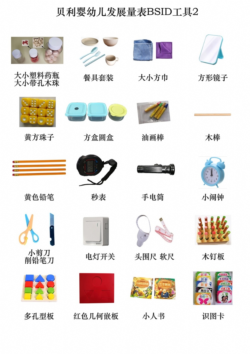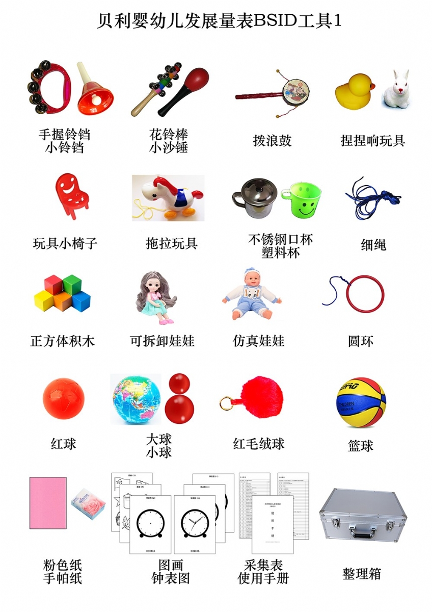 手握鈴鐺、小鈴鐺、花鈴棒、撥浪鼓、小沙錘、捏捏響玩具、玩具小椅子、拖拉玩具(帶線)、小正方體積木(紅12個(gè),黃藍(lán)綠各2塊)、可拆卸娃娃、布娃娃、圓環(huán)、紅球、大球、紅毛絨球、籃球、紅色小球、細(xì)繩、不銹鋼口杯、塑料杯、大號塑料藥瓶、小號塑料藥瓶、餐具套裝、大小方巾、方形鏡子、大木珠(帶孔)、小木珠(帶孔、)黃方珠子、塑料方盒、塑料圓盒、油畫棒、指揮棒、黃色鉛筆、秒表、手電筒、小鬧鐘、電燈開關(guān)、頭圍尺、軟尺、木釘板、多孔型板(含圓形、方形、三角形各4塊)、幾何嵌板(含圓、三角、方形,厚8mm)、小人書識(shí)圖卡(果蔬、人物、動(dòng)物、交通等)、粉色卡紙、手帕紙、鐘表圖1234、圖畫12(BSID)、BSID采集表、BSID使用手冊、整理箱等。